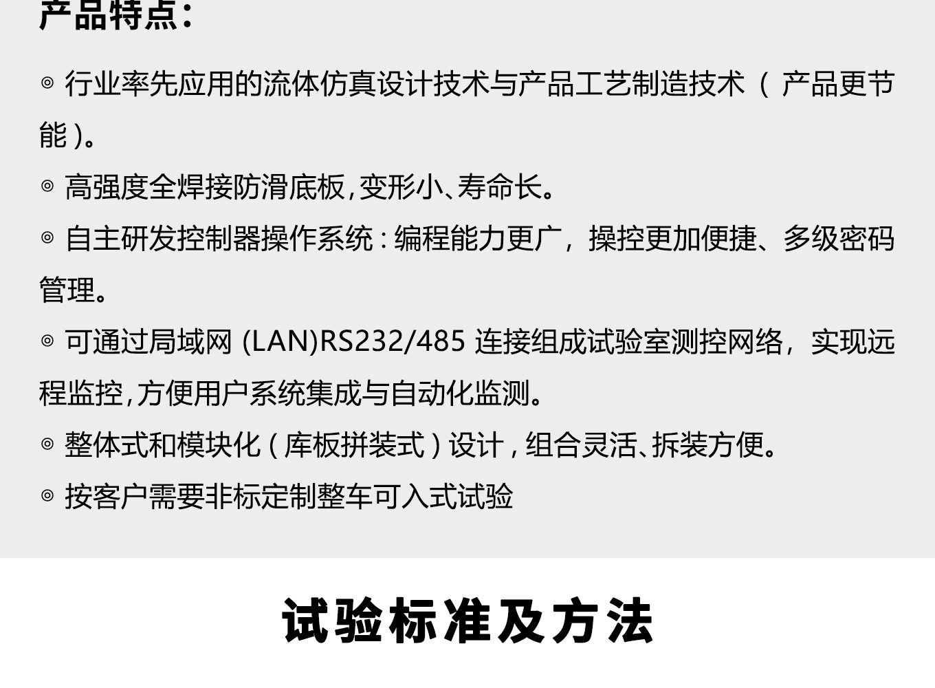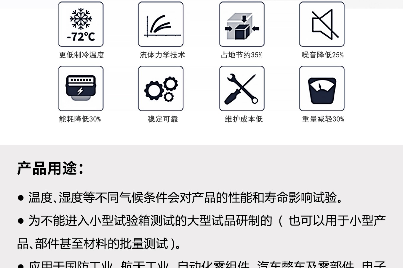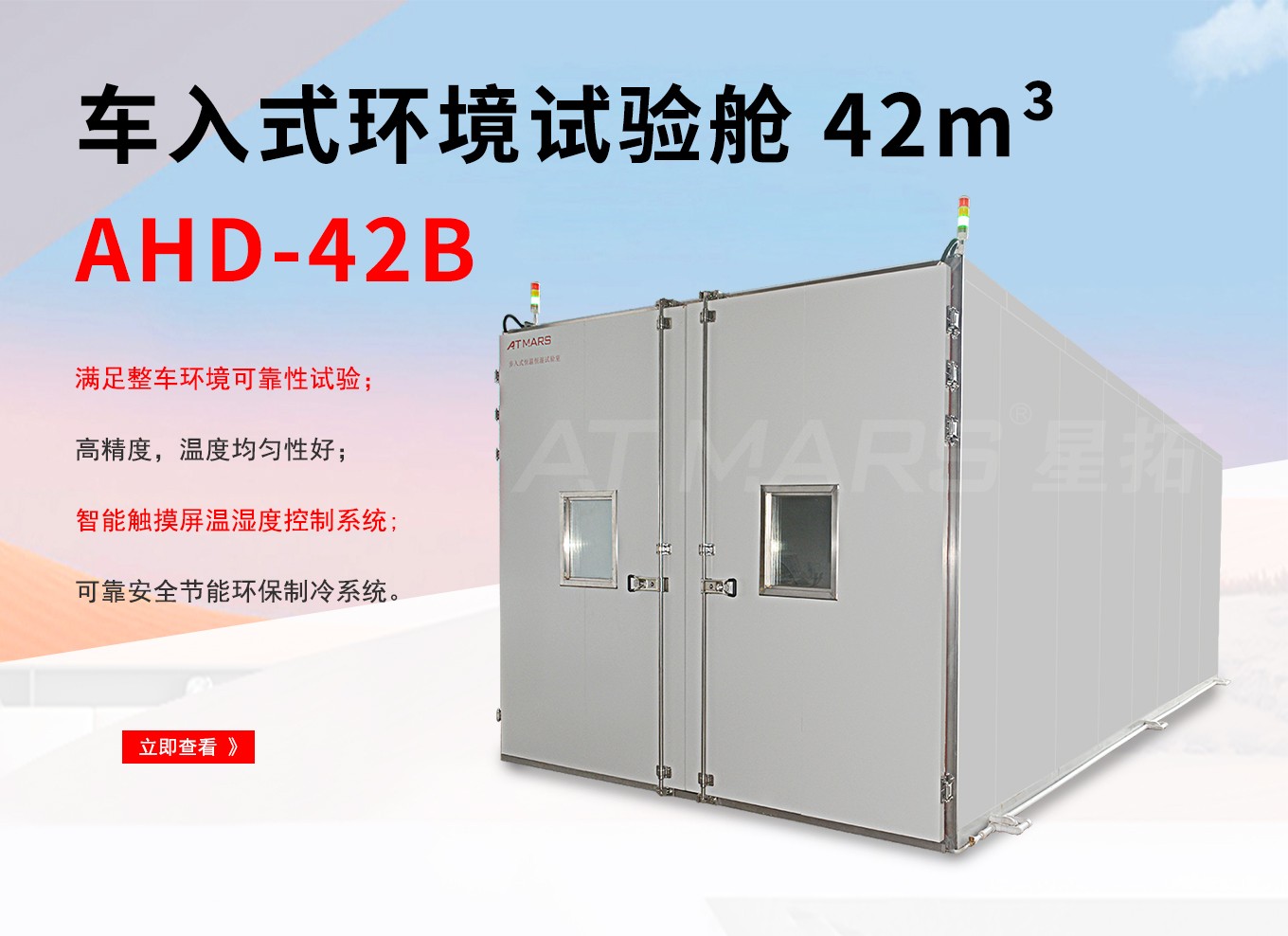 车入式环境试验舱,用于模拟高温环境对测试件温度应力测试,温湿度老化测试,性能测试,耐候测试,温度类存储测试等。自主研发高性能控制器:精准控温,功能全面,界面友好。节能降噪:基于流体力学仿真设计优化风道系统,风路循环更合理,灵活可靠的制冷系统设计,兼顾特殊温湿度点和常用实验点,设备运行处于最节能、低噪音状态。