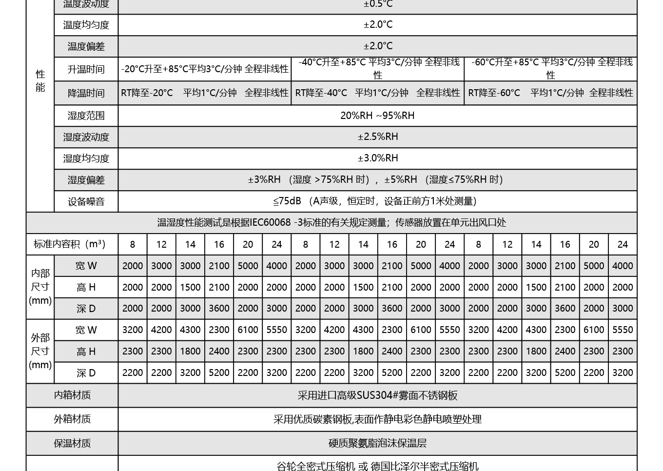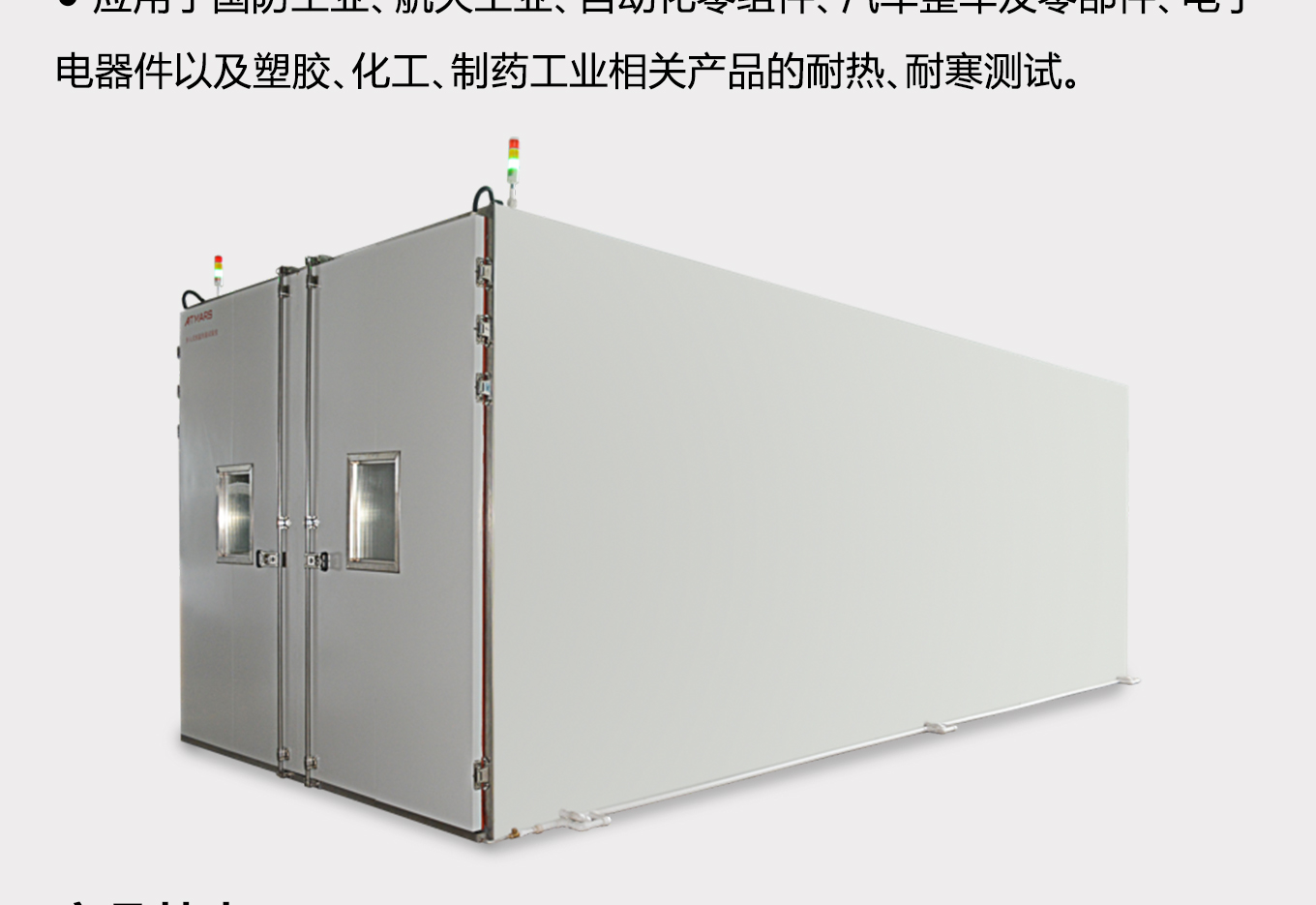 车入式环境试验舱,专为大型试件高温、低温、恒定湿热及交变湿热试验设计,提供常见内容积为2.5m³、6.6m³、8m³、12.5m³、20m³、25m³、46m³、84m³和300m³的产品以及安装施工方案(支持非标定制)广泛应用于航空航天、国防军工、汽车机电、信息通讯、新能源整车及配件批量及大件样品环境试验。