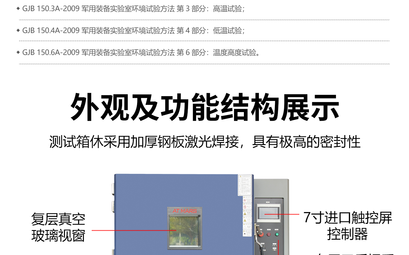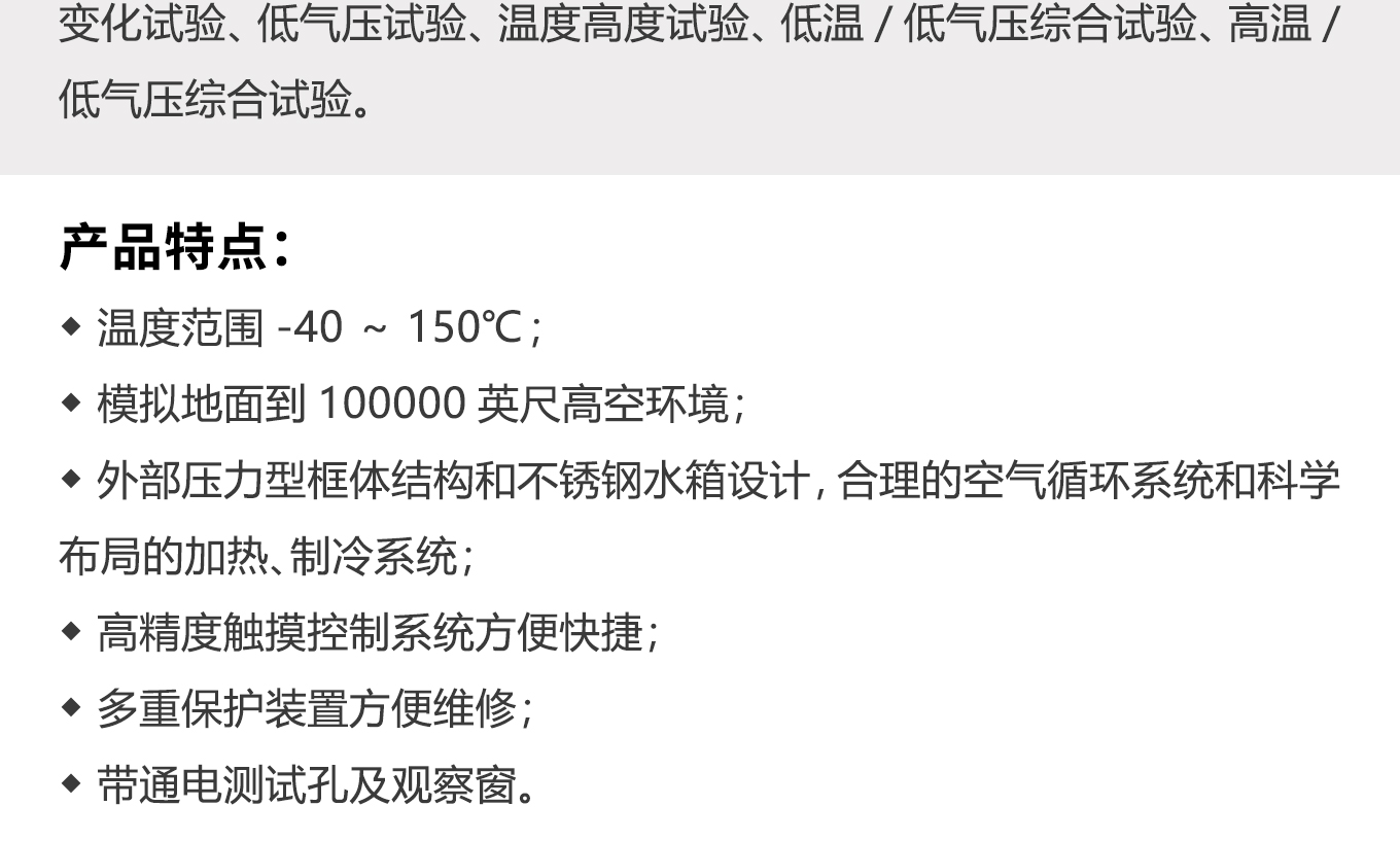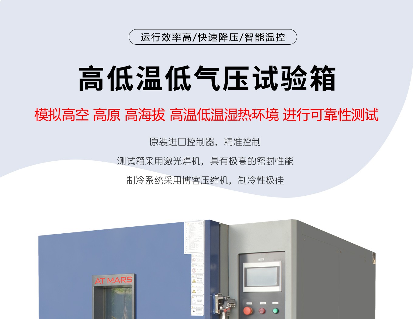 高低温低气压糖心视频下载官网适用于国防工业,航天工业自动化零组件,汽车部件,电池,平面显示屏模组工业及相关产品料进行环境试验-高温试验、低温试验、温度变化试验、低气压试验、温度高度试验、低温/低气压综合试验、高温/低气压综合试验。