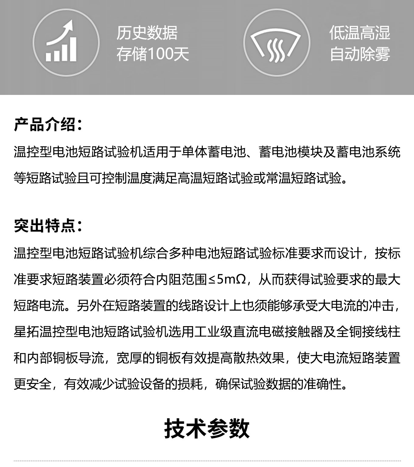 温控型电池短路试验机适用于单体蓄电池、蓄电池模块及蓄电池系统等短路试验且可控制温度满足高温短路试验或常温短路试验。