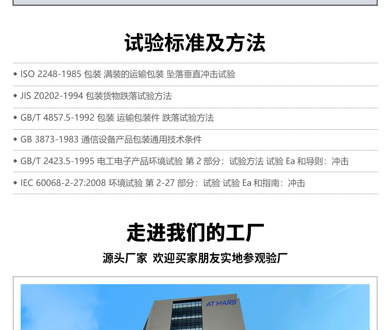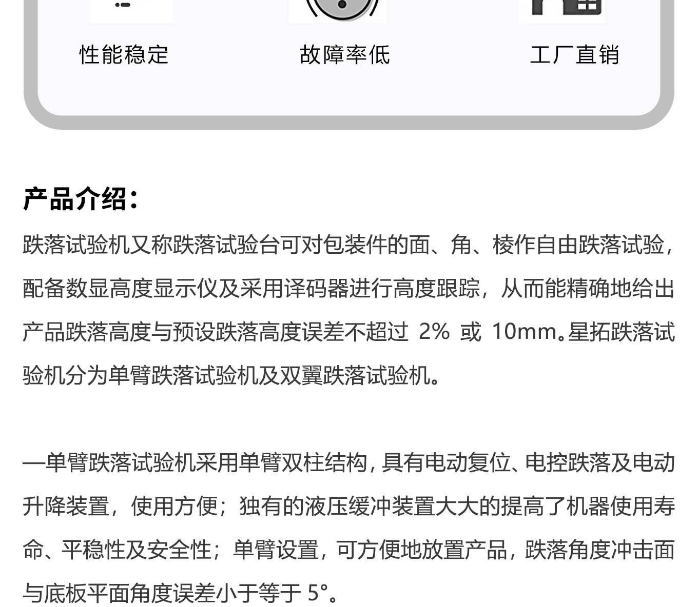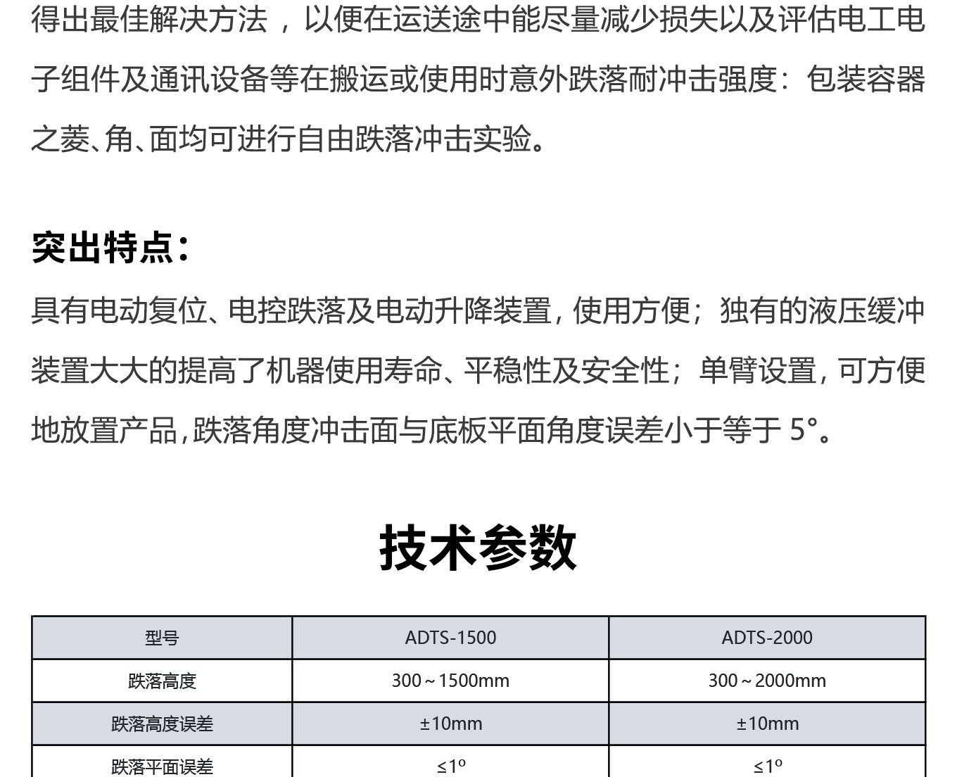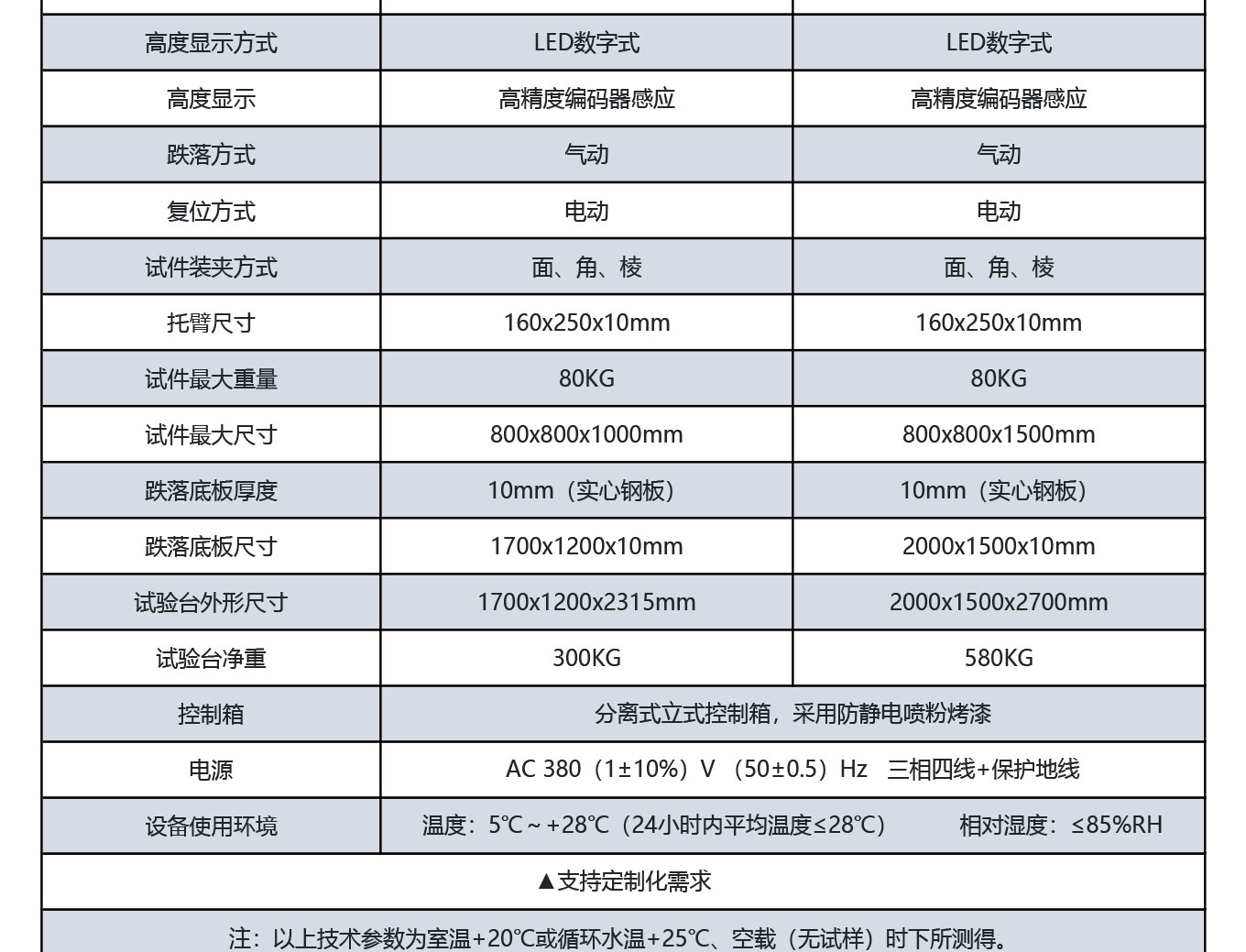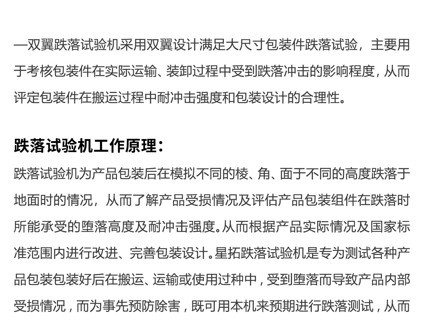 跌落试验机又称跌落试验台可对包装件的面、角、棱作自由跌落试验,配备数显高度显示仪及采用译码器进行高度跟踪,从而能精确地给出产品跌落高度与预设跌落高度误差不超过2%或10mm。糖心VLOG在线观看官网跌落试验机分为单臂跌落试验机及双翼跌落试验机。