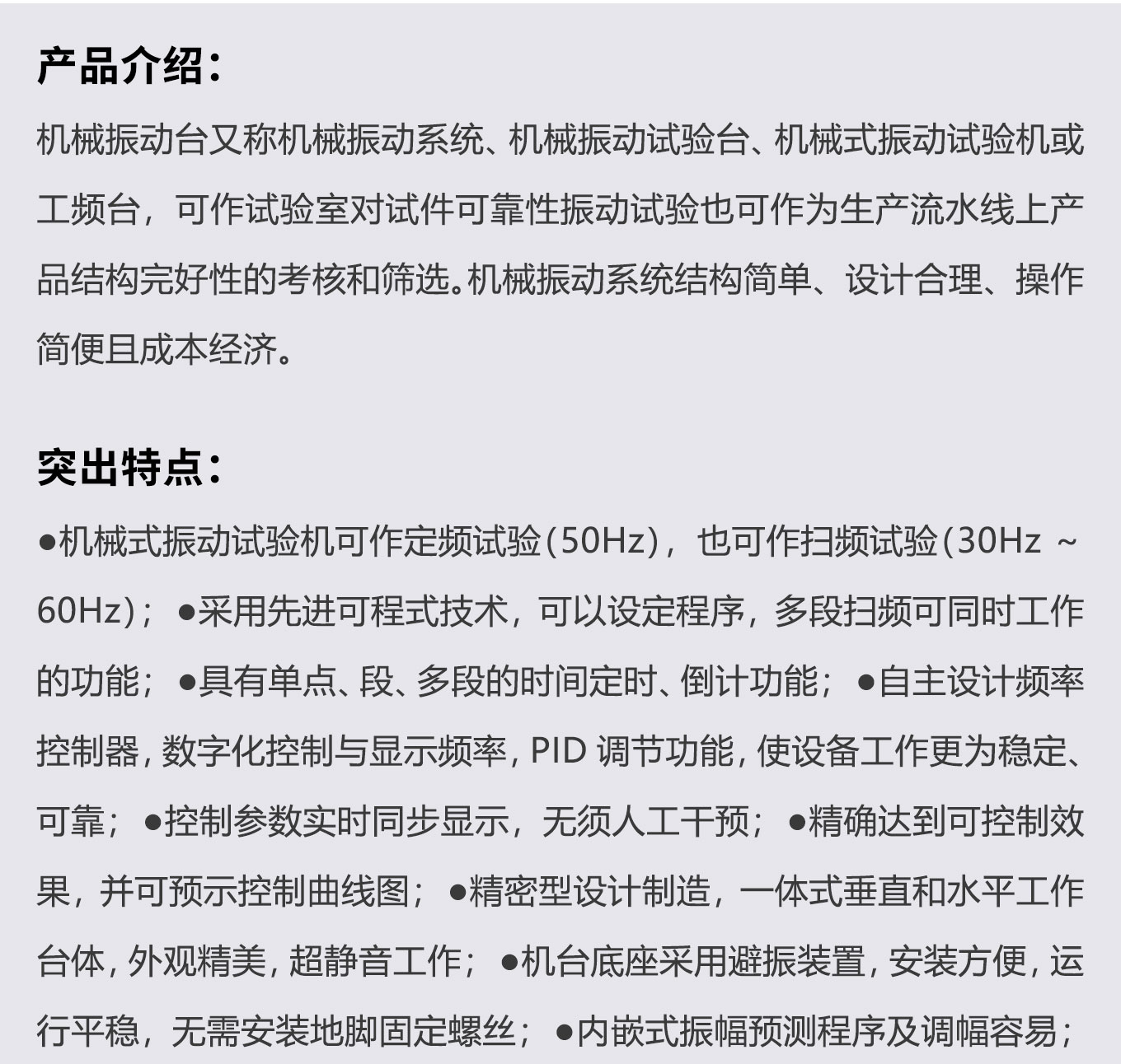 机械振动台又称机械振动系统、机械振动试验台、机械式振动试验机或工频台,可作试验室对试件可靠性振动试验也可作为生产流水线上产品结构完好性的考核和筛选。机械振动系统结构简单、设计合理、操作简便且成本经济。
