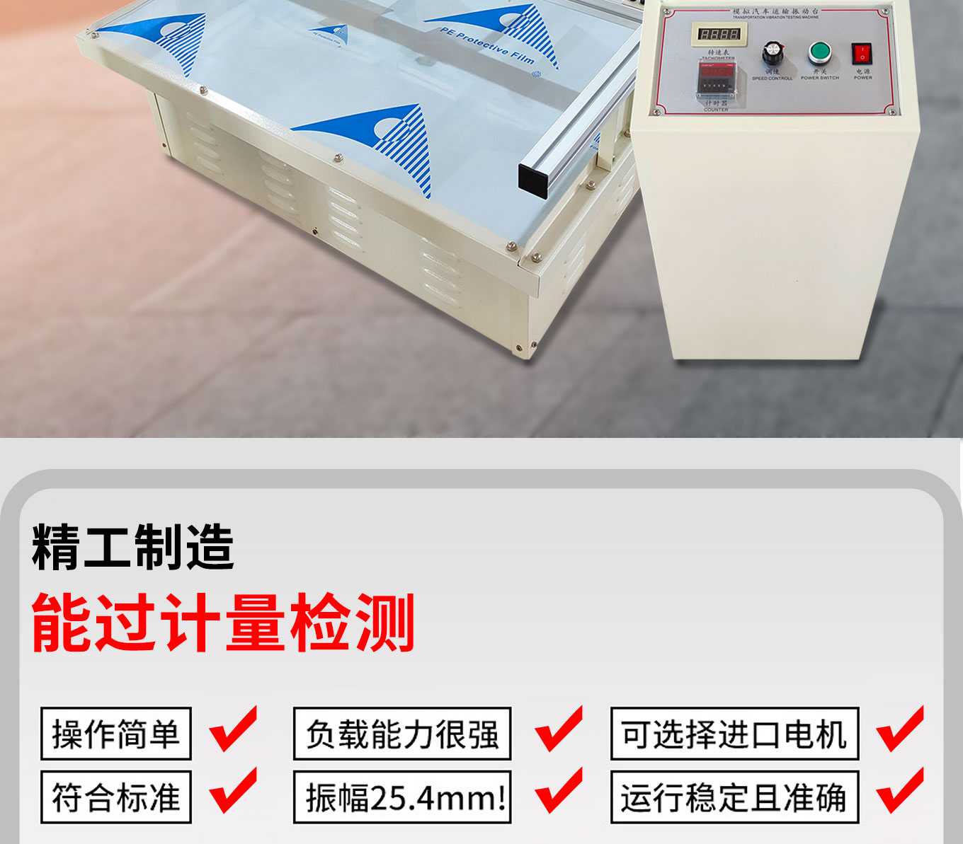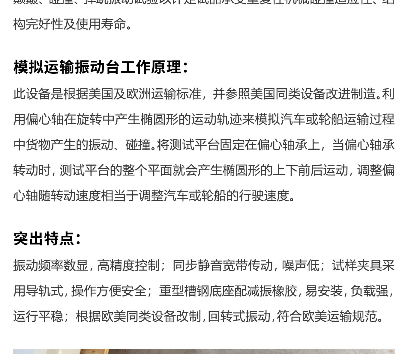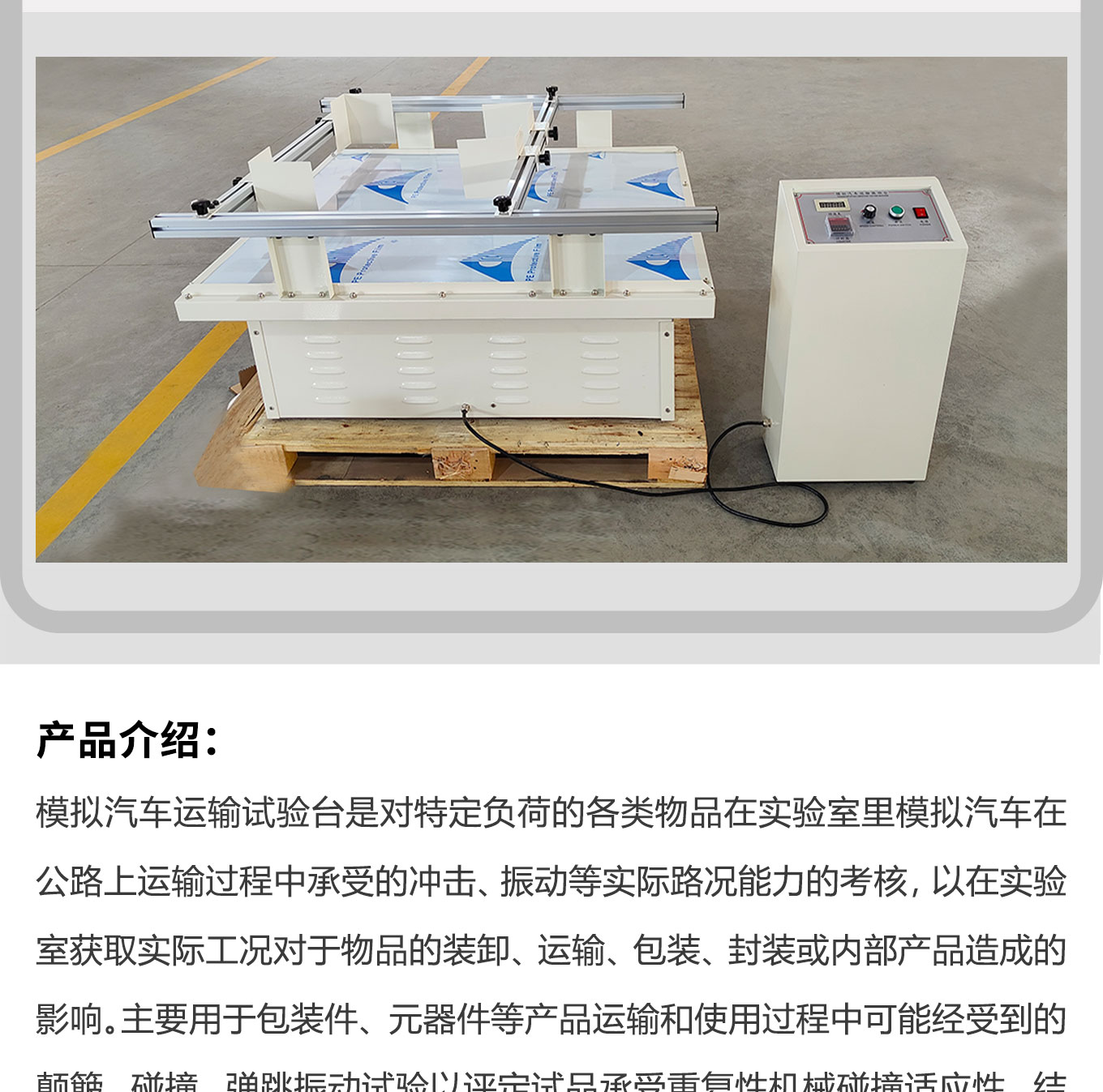模拟汽车运输振动试验台主要用于包装件、元器件等产品运输和使用过程中可能经受到的颠簸、碰撞、弹跳振动试验以评定试品承受重复性机械碰撞适应性、结构完好性及使用寿命。