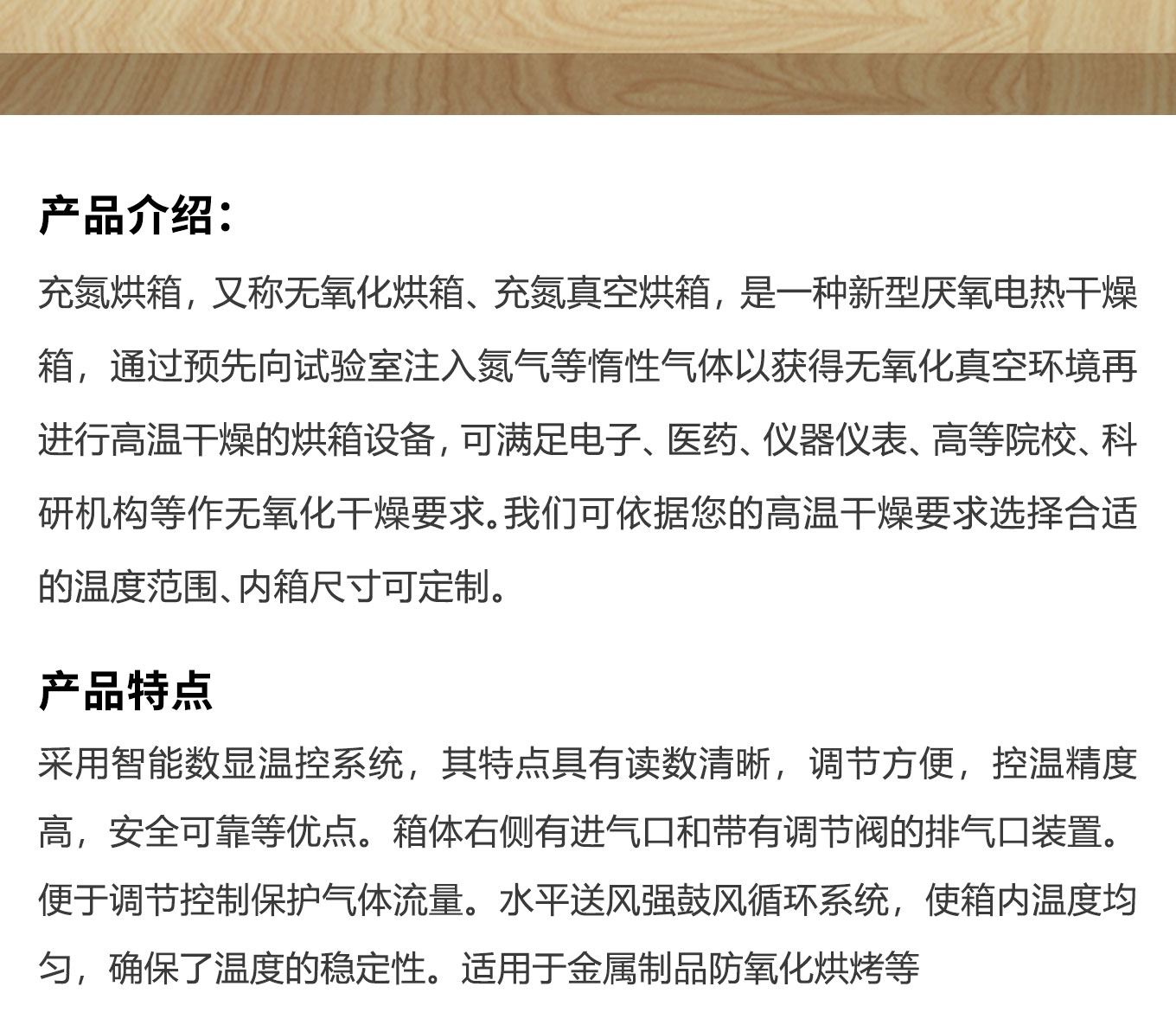 充氮烘箱,又称无氧化烘箱、充氮真空烘箱,是一种新型厌氧电热干燥箱,通过预先向试验室注入氮气等惰性气体以获得无氧化真空环境再进行高温干燥的烘箱设备,可满足电子、医药、仪器仪表、高等院校、科研机构等作无氧化干燥要求。糖心VLOG在线观看官网可依据您的高温干燥要求选择合适的温度范围、内箱尺寸可定制。