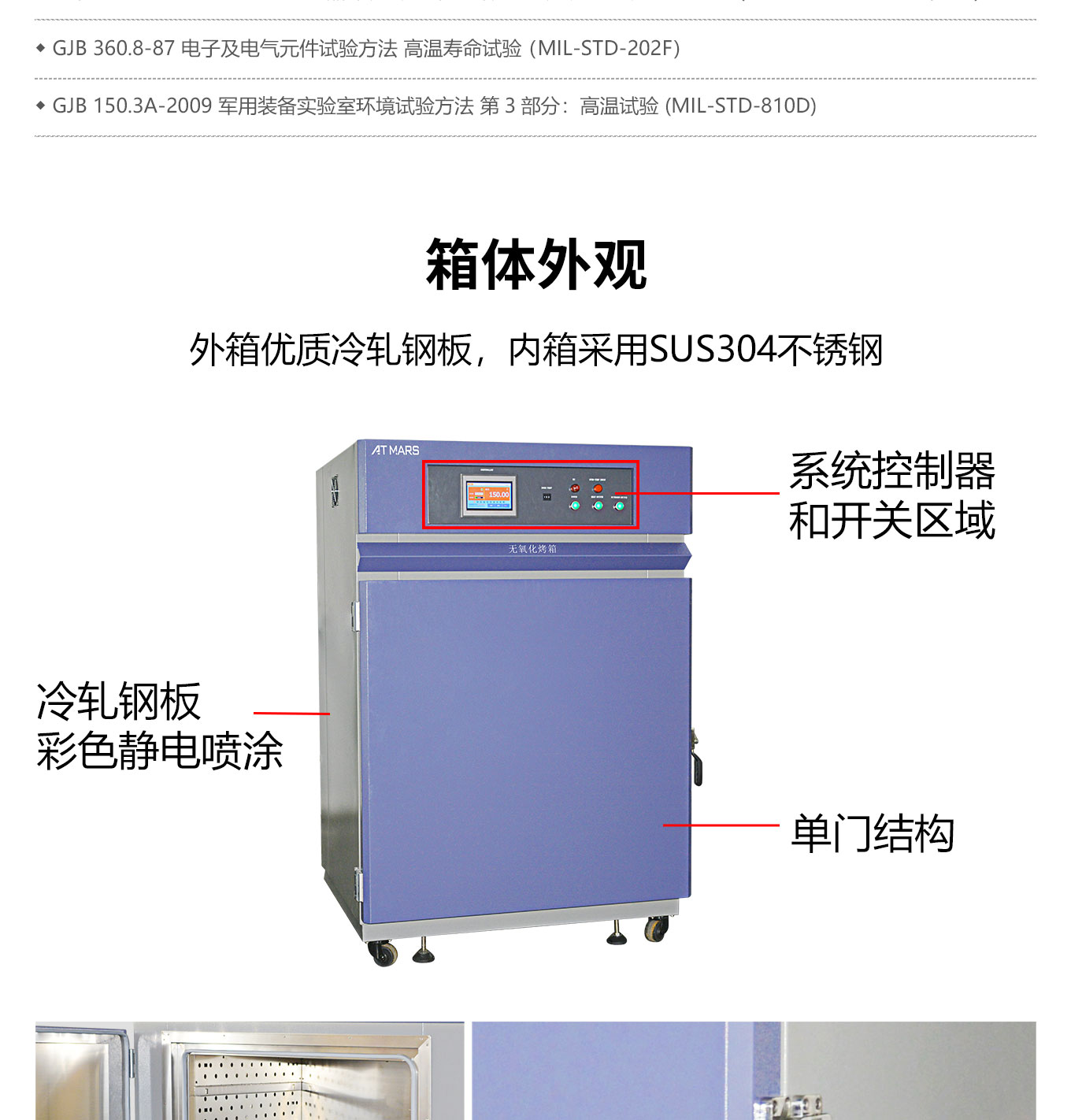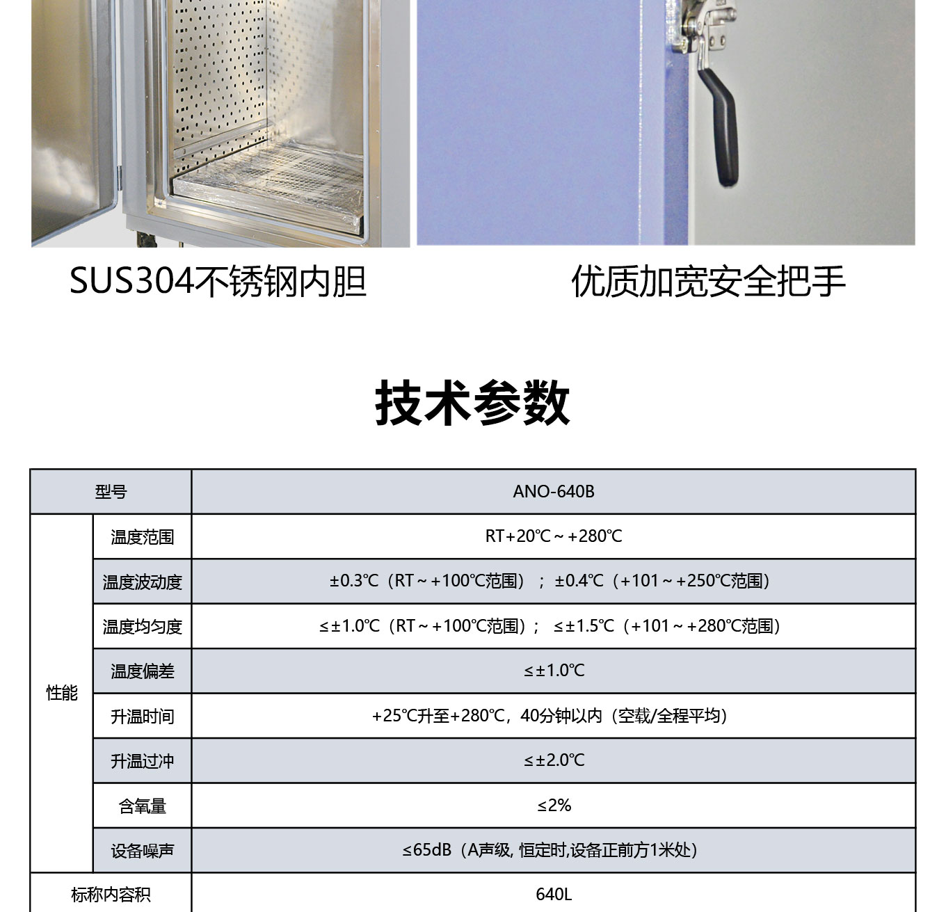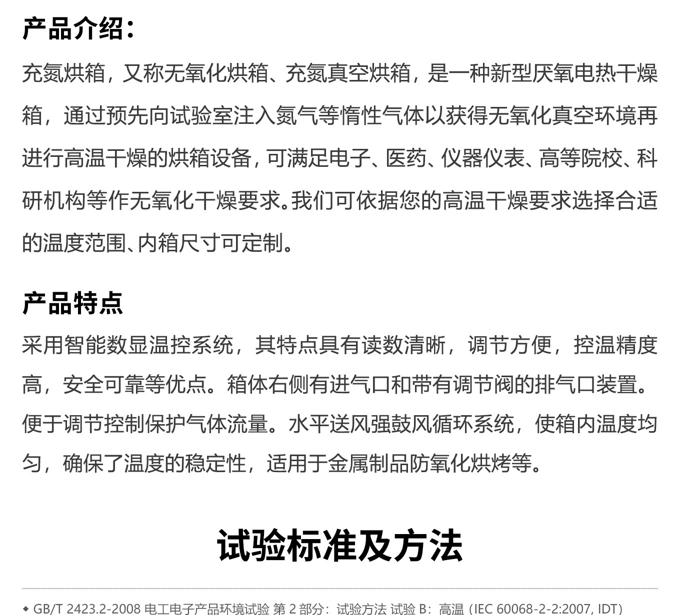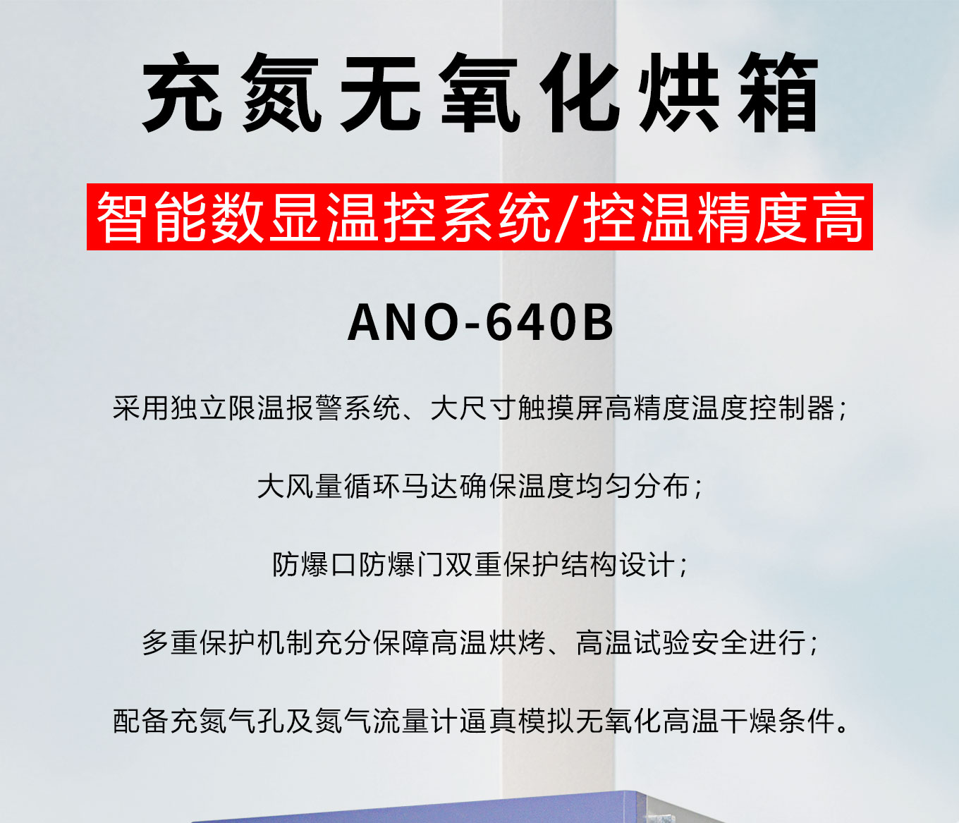 采用独立限温报警系统、大尺寸触摸屏高精度温度控制器;大风量循环马达确保温度均匀分布;防爆口防爆门双重保护结构设计;多重保护机制充分保障高温烘烤、高温试验安全进行;配备充氮气孔及氮气流量计逼真模拟无氧化高温干燥条件。