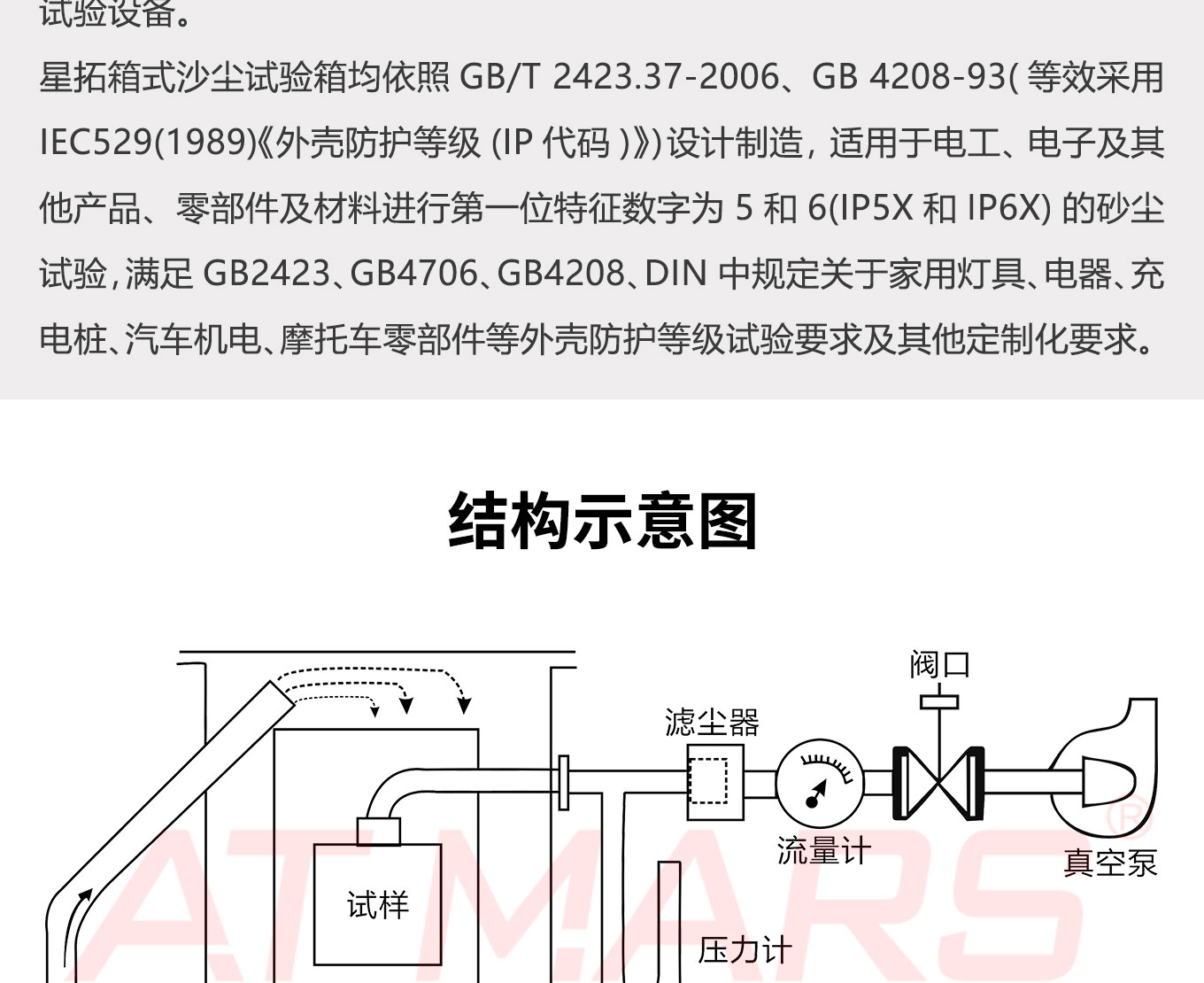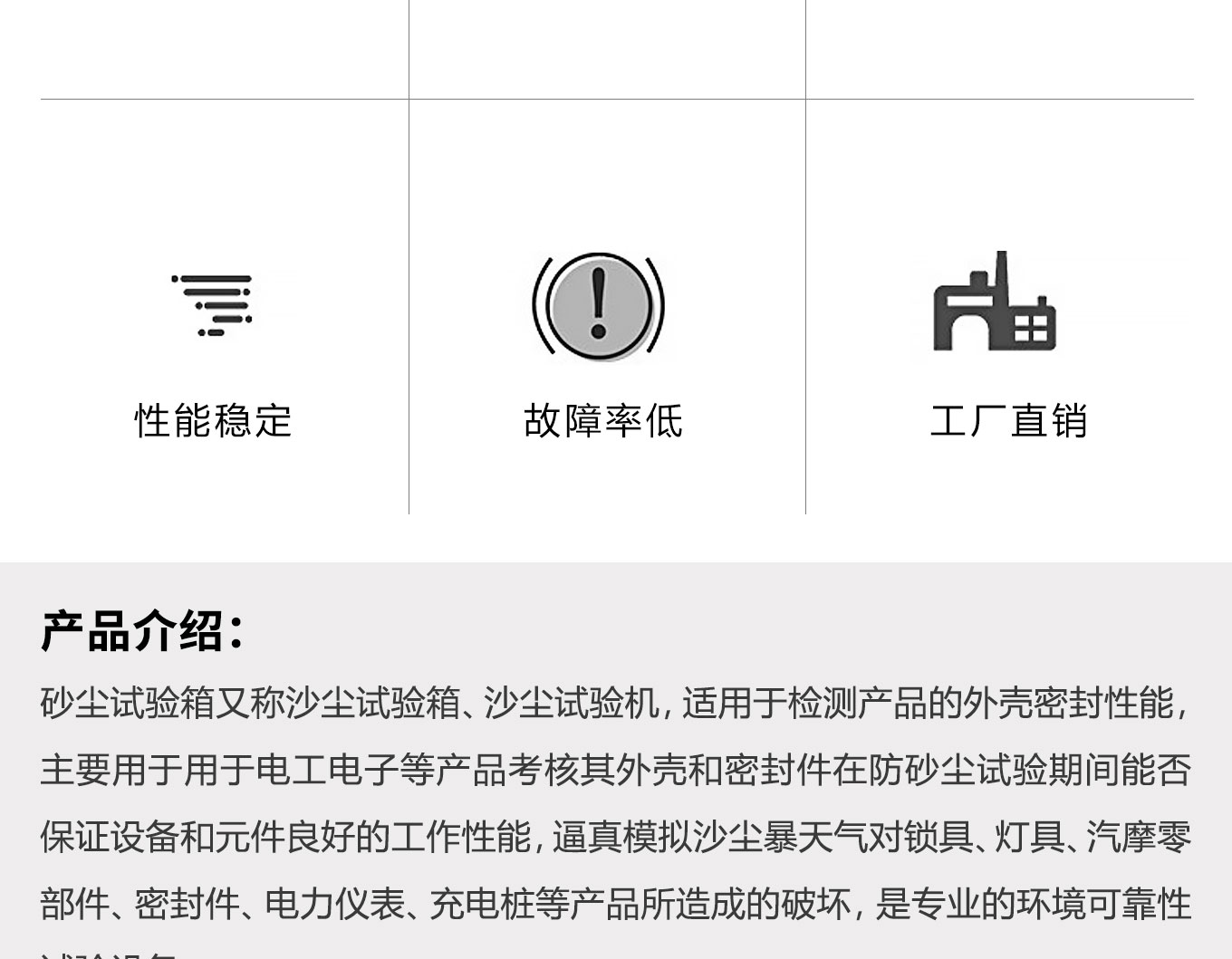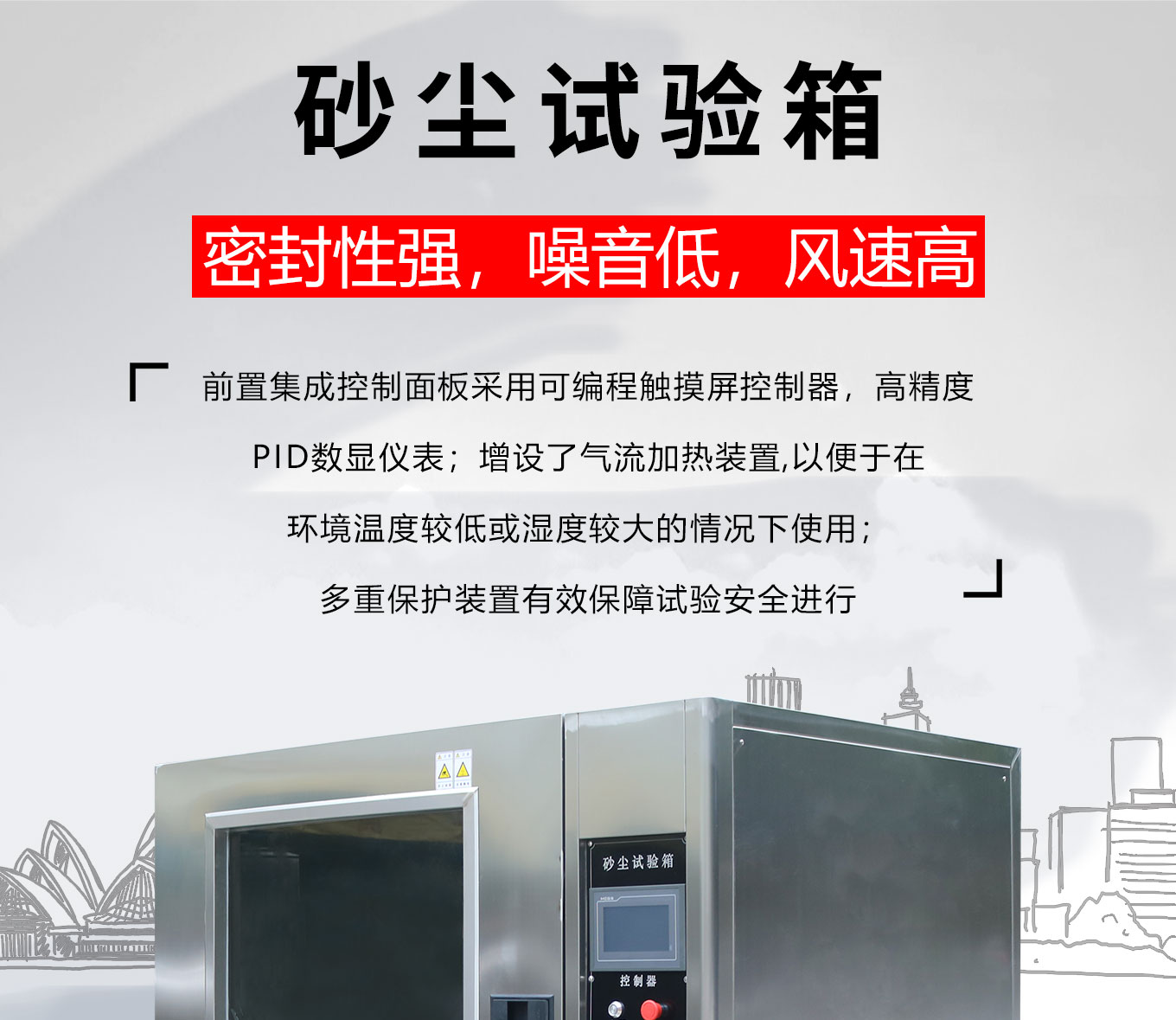 砂尘糖心视频下载官网又称沙尘糖心视频下载官网、沙尘试验机,适用于检测产品的外壳密封性能,主要用于用于电工电子等产品考核其外壳和密封件在防砂尘试验期间能否保证设备和元件良好的工作性能,逼真模拟沙尘暴天气对锁具、灯具、汽摩零部件、密封件、电力仪表、充电桩等产品所造成的破坏,是专业的环境可靠性试验设备。