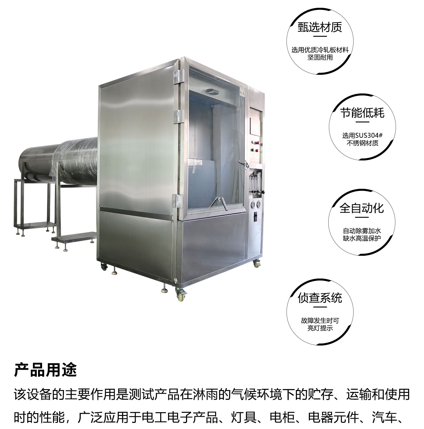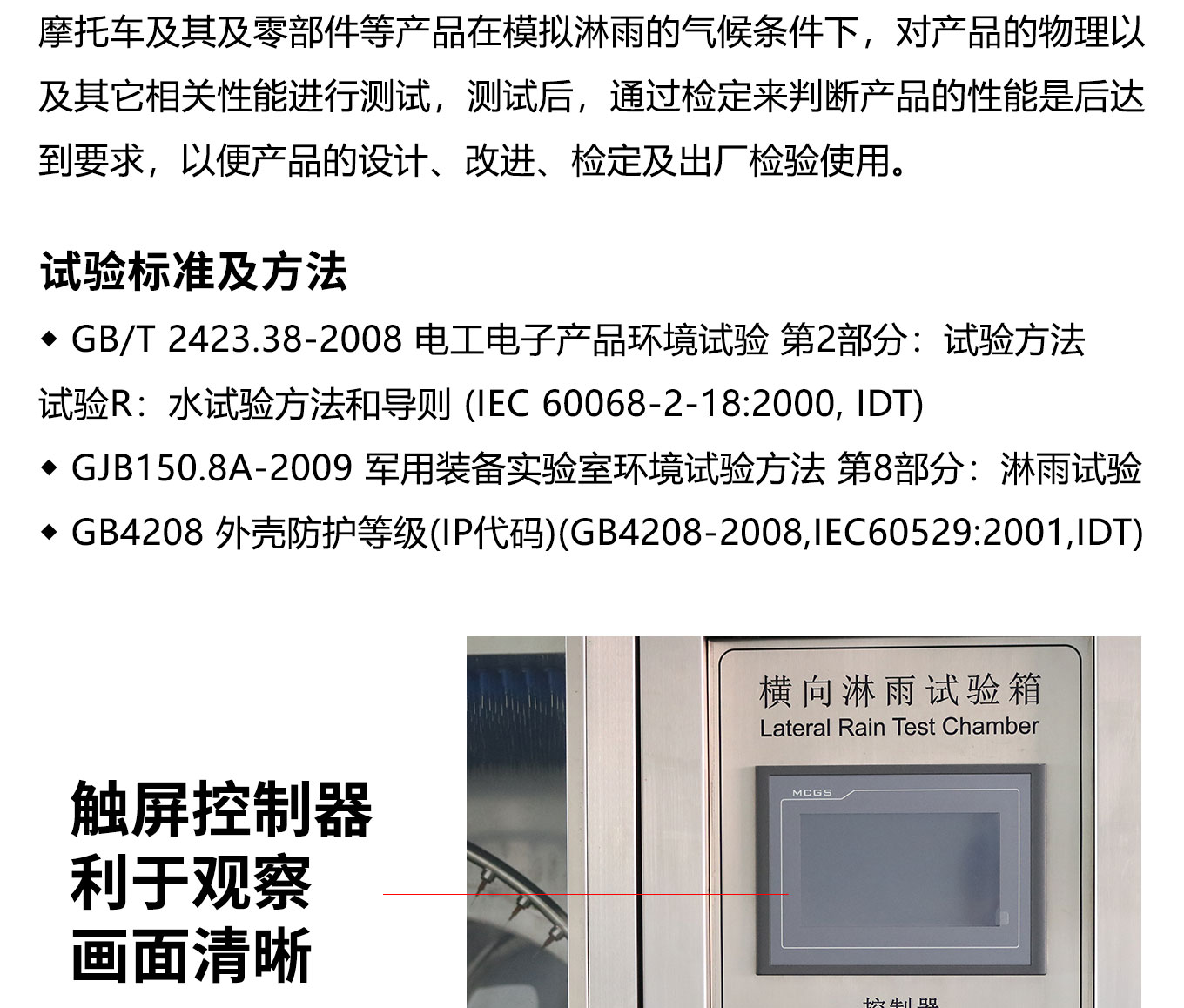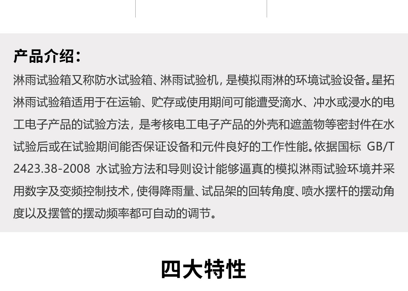 依据国标GB/T 2423.38-2008水试验方法和导则设计能够逼真的模拟淋雨试验环境并采用数字及变频控制技术,使得降雨量、试品架的回转角度、喷水摆杆的摆动角度以及摆管的摆动频率都可自动的调节。