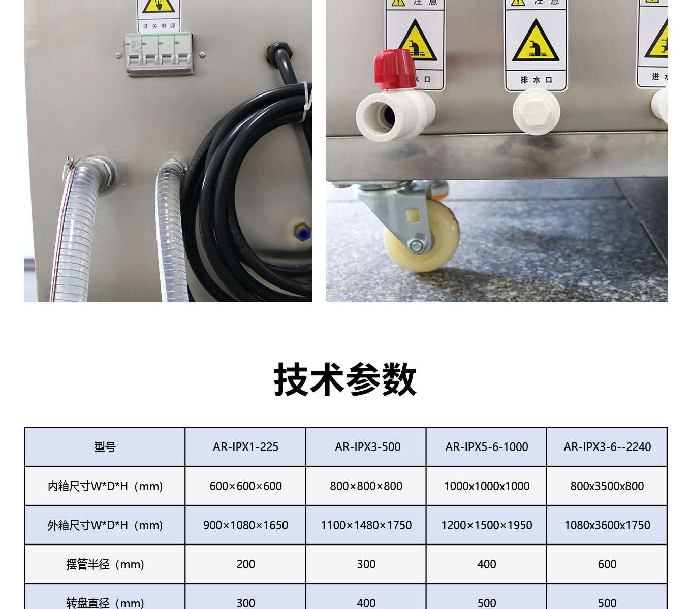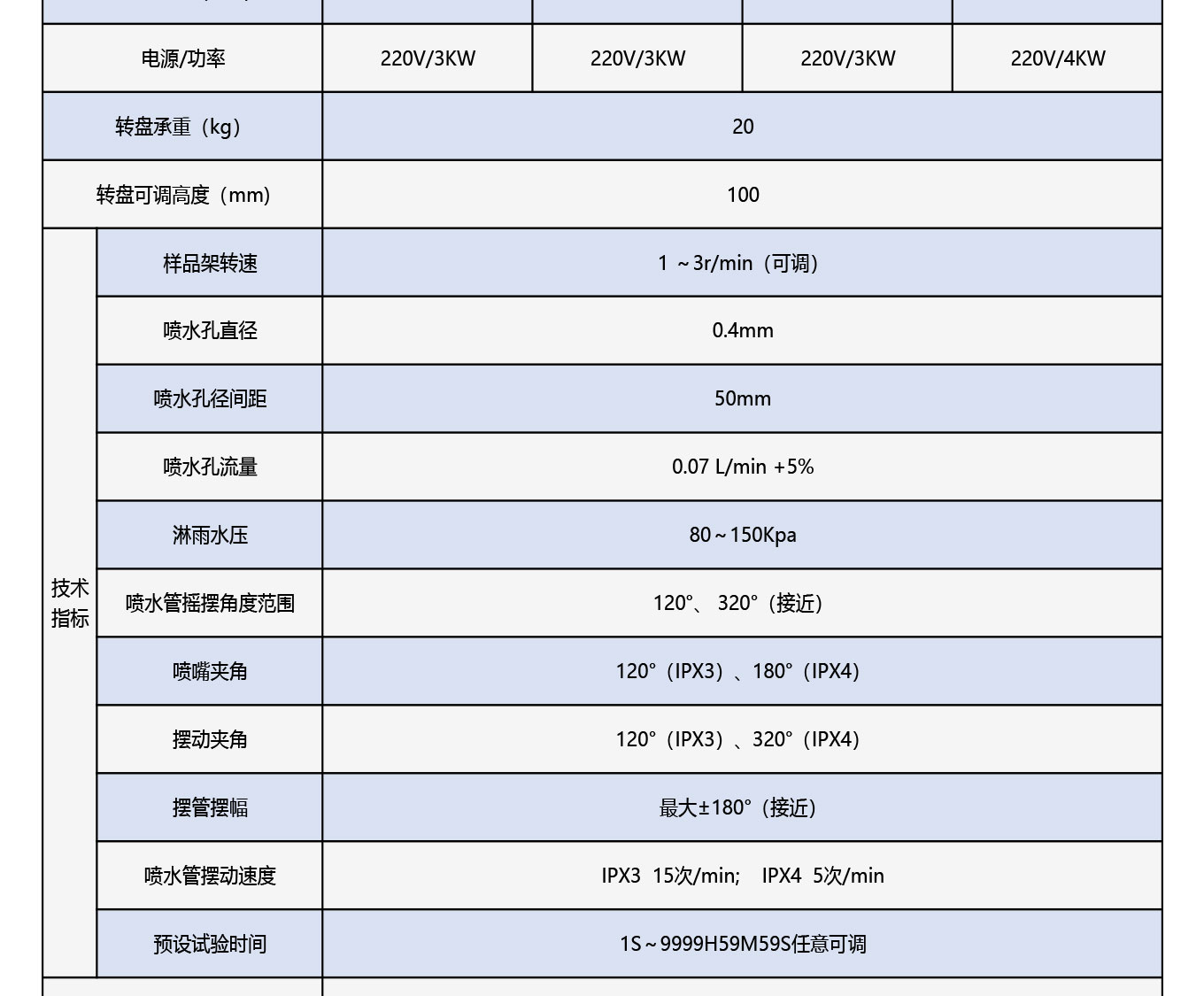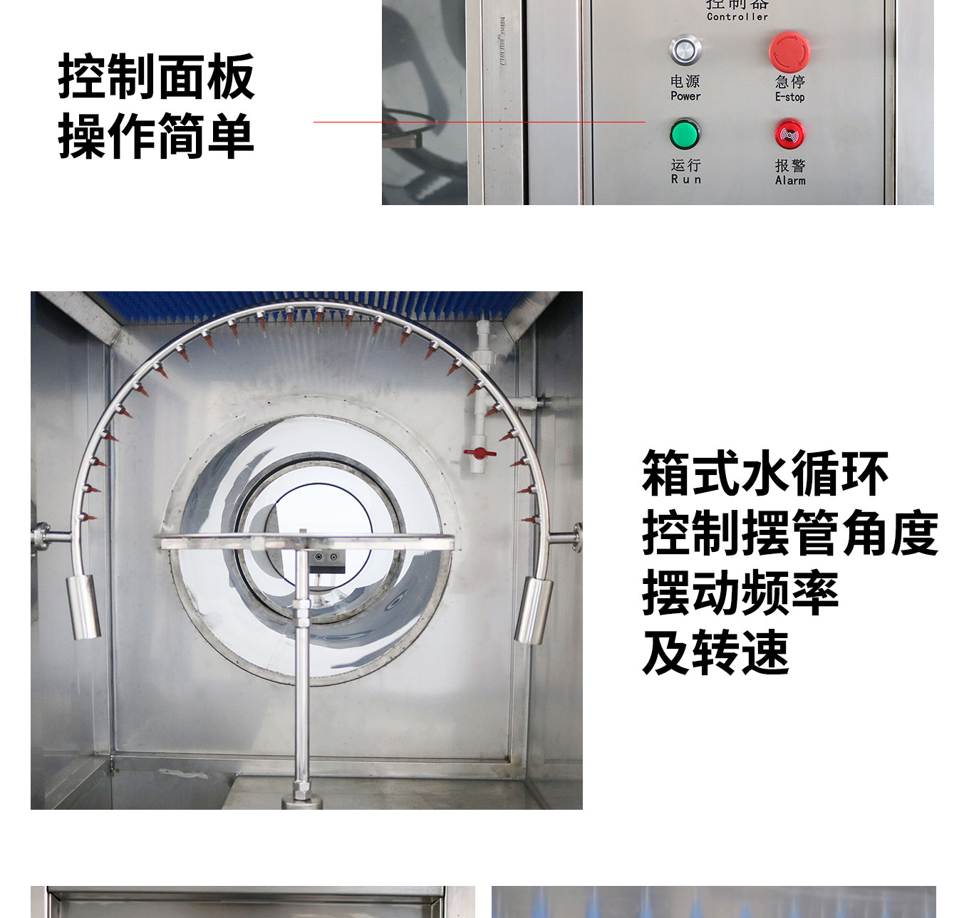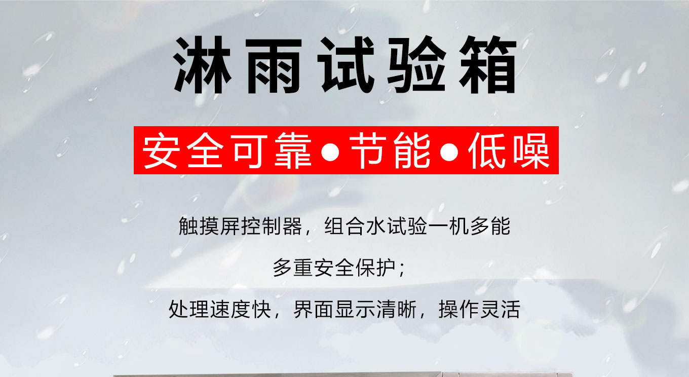 依据国标GB/T 2423.38-2008水试验方法和导则设计能够逼真的模拟淋雨试验环境并采用数字及变频控制技术,使得降雨量、试品架的回转角度、喷水摆杆的摆动角度以及摆管的摆动频率都可自动的调节。