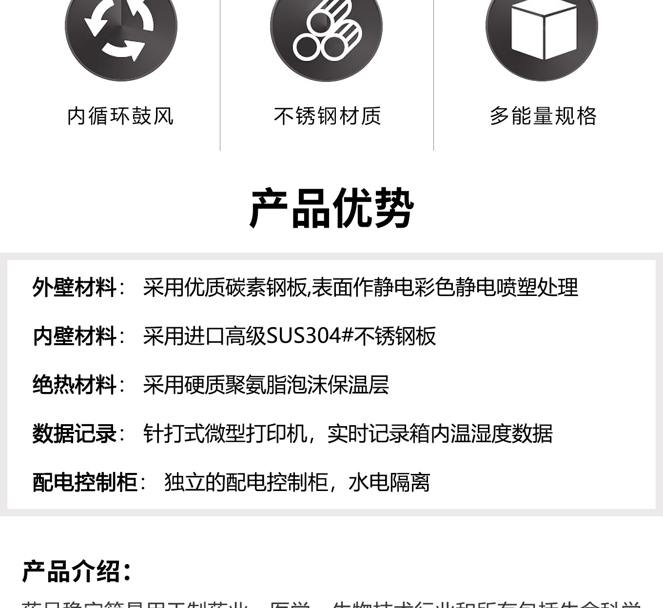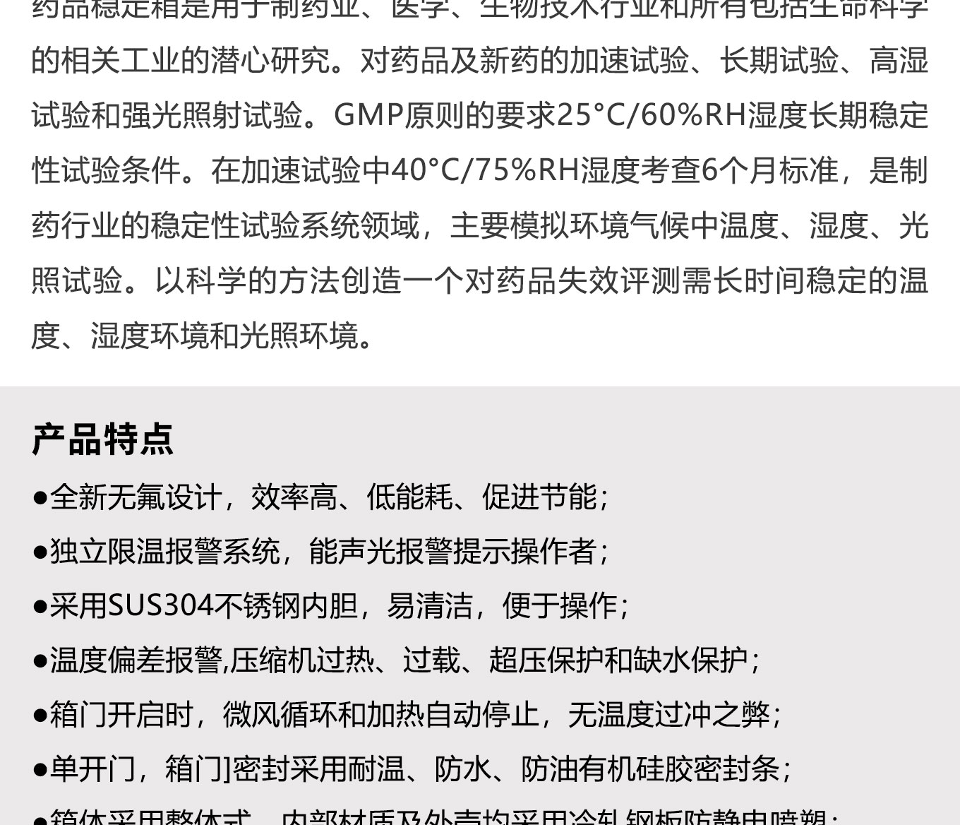 药品稳定箱是用于制药业、医学、生物技术行业和所有包括生命科学的相关工业的潜心研究。对药品及新药的加速试验、长期试验、高湿试验和强光照射试验。主要模拟环境气候中温度、湿度、光照试验。以科学的方法创造一个对药品失效评测需长时间稳定的温度、湿度环境和光照环境。